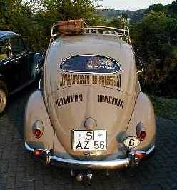 | Ausstattung und Besonderheiten | HELLA Nebelscheinwerfer mit gelbem Glas für Volkswagen-Käfer (kleinere Gehäuseform, damit die Kofferraumhaube problemlos zu öffnen ist), Steinschlag-Schutzgitter für Hauptscheinwerfer der Fa. OETTINGER von Rallye-Käfer (gab es sonst nur von Volkswagen Australien bzw. in den skandinavischen Ländern), Hupengitter der Fa. EMPI, Insekten- bzw. Schneeabweiser auf der vorderen Haube, Original BeKöWa Holzlatten-Dachgepäckträger, Ventshades von Volkswagen USA (Fahrerseite) als Witterungs- und Windschutz, AEROLATOR (Beifahrerseite) zur zugfreien Belüftung des Fahrzeuginneren (sog. Bienenfänger), RABAMBUS Fußraumablage, hintere Austellfenster (VW-Originalzubehör), KAMEI-Benzinhahnverlängerung, Zeituhr ( Fabr. KÖHLER im VW-Design, anstelle Lautsprechergitter), Elektrischer Drehzahlmesser von VDO (Vertrieb durch Fa. OETTINGER), UKW-Radio BLAUPUNKT Frankfurt (Röhrengerät, baugleich wie Porsche 356), HELPHOS-Suchscheinwerfer zur Befestigung innen an der Frontscheibe, Türzuggriffe innen (sog. Doorpulls) der Fa. EMPI, Handschuhfachgriff der Fa. EMPI, 100.000-km-Plakette von VW, abblendbarer Innenspiegel, Zigarrenanzünder anstelle Zündschloss (der Erstbesitzer war Direktor und deswegen standesgemäß Zigarrenraucher), VW Nachrüstdiebstahlschutz mit integriertem Zündschloss an der Lenksäule, VW Nachrüst-Wisch-Wasch-Anlage, zeitgenössischer CO2-Feuerlöscher, original VW Werkzeugkasten zum Einklemmen in das Reserverad ( HAZET), original VW Reservekanister (7 Liter), VW Benzinmessstab aus Aluminium zum Eintauchen in den Tank mit Rest-Kilometer-Angabe, Beifahrersonnenblende, PEKA Anhängerkupplung, Cabrio-Heckklappe (Wasserablaufkästen entfernt, wg. Judson-Kompressor). |